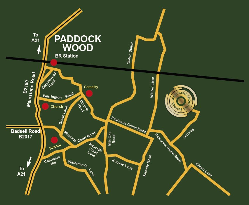 Follow the signs for Paddock Wood turning right off the A20 at Wrotham under the railway bridge and up the road called Seven Mile Lane (B2016). At the roundabout go straight across (A228) (second part of Seven Mile Lane). At the end of this second section at Roundabout go straight over (sign posted for Paddock Wood) – at second roundabout (past Hop Farm on your right) turn left (B2160) towards Paddock Wood. Follow road into Paddock Wood, over railway bridge, pass the Esso Garage on the left, through the pedestrian crossing and then turn left into Warrington Road go to ‘T’ Junction, turn right up to staggered crossroads.